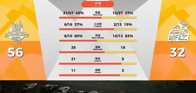 半场打完,山东在鲍威尔、陶汉林、克里斯合砍42分的带领下,取得56-32领先广厦,几乎可以说是完全碾压广厦!得分篮板助攻抢断,数据全面领先广厦,胡金秋正负值-25,孙铭徽-29,布朗毫无状态,广厦三巨头合计仅得7分。
