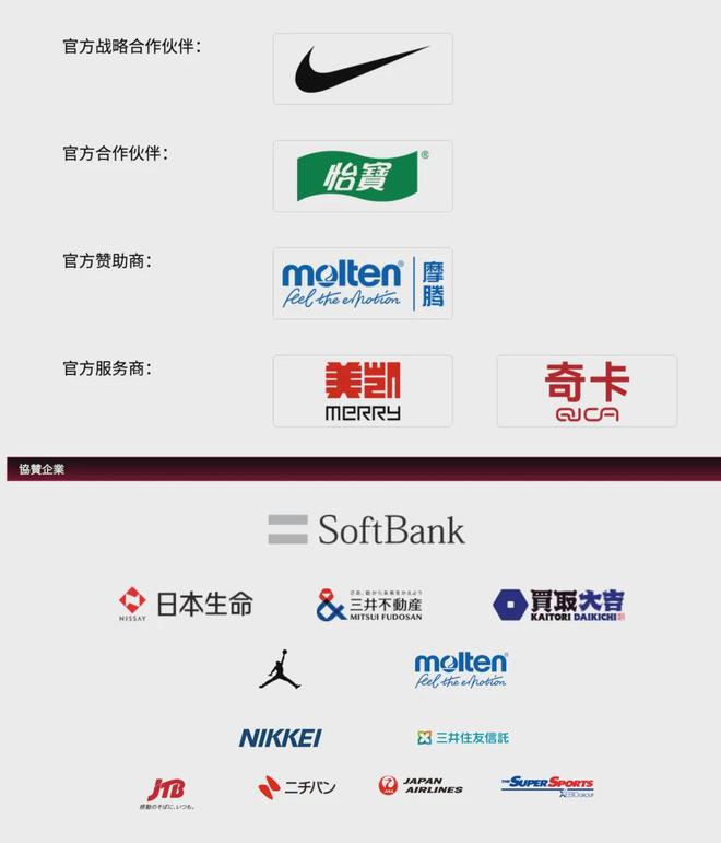反观日本男篮的赞助商阵容可谓强大。不仅赞助商数量多达12家,而且其中不乏众多日本国民知名度颇高的企业,例如软银(SoftBank)、日本航空、日本生命以及NIKKEI(日本经济新闻社)等。除此之外,日本男篮还有着日本知名财团三井系的支持。