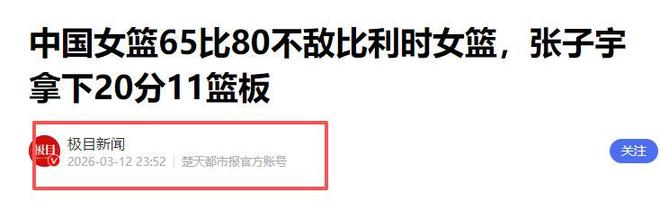 极目新闻2026-03-12《中国女篮65比80不敌比利时女篮,张子宇拿下20分11篮板》