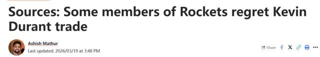 北京时间3月20日,据美媒Ahn Fire Digital报道,消息人士透露,休斯顿火箭队部分成员对休赛期交易得到凯文-杜兰特一事感到后悔。火箭通过一笔涉及篮网、勇士、老鹰、湖人、森林狼在内的七队重磅交易,从太阳得到了杜兰特。