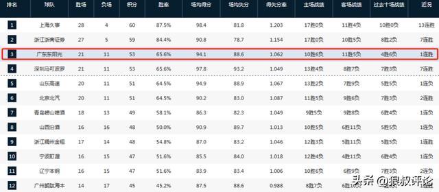 截止目前,广东男篮的战绩为21胜11负,排在积分榜第三,但近况并不是理想,先后不敌新疆,北京,江苏,上海,辽宁,与广厦,上海相比,战绩持续下滑,焦泊乔更是私人原因离队。