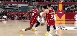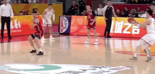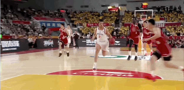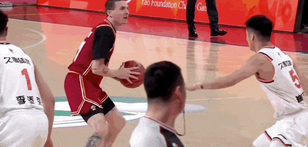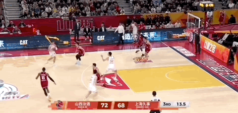 第三节上海男篮的最后一攻,李添荣开边线球,古德温外线接球,面对迪亚洛,干拔三分不进,怀特塞德拿到篮板,传给李添荣,直塞篮下刘礼嘉,后者成功吃饼。