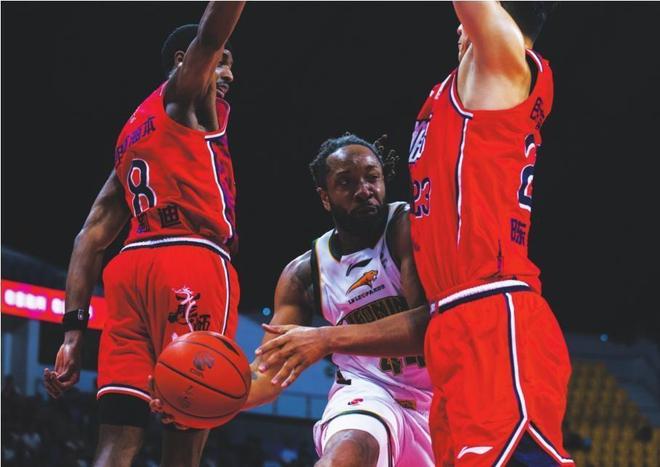 3月28日,辽宁男篮球员威尔斯(中)在比赛中伺机传球。 新华社发