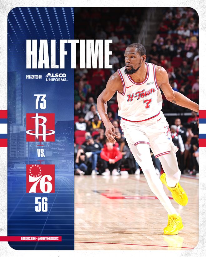 火箭队的杜兰特得到29分、6个篮板和5次助攻,全场8罚6中,生涯罚中球数超越大O升至历史第6位。汤普森得到19分、4个篮板和4次助攻,史密斯得到19分和5个篮板,伊森得到15分和8个篮板,奥科吉得到9分和10个篮板,申京得到8分和11个篮板。76人队的马克西得到23分和5次助攻,埃奇库姆得到21分、6个篮板和8次助攻,格里梅斯得到20分,乌布雷得到16分和4个篮板。