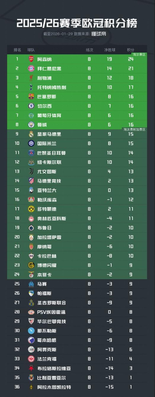 北京时间1月29日,2025/26欧冠联赛阶段最后一轮18场全部战罢,英超球队在联赛阶段整体上表现最佳,有五队直接晋级欧冠十六强。参加淘汰赛附加赛的球队中意甲球队最多,共三支。