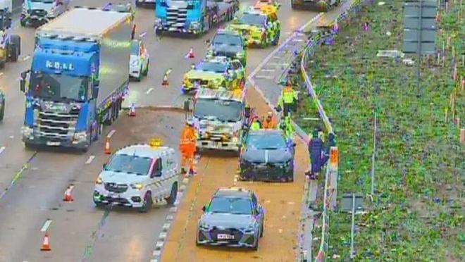 从媒体曝光的现场图片来看,穆阿尼和奥多贝尔站在路边,身旁是一辆撞毁的法拉利,车内安全气囊已经弹出,右前轮爆裂,轮毂脱落,同时车辆的轮拱和前格栅也受损。挡风玻璃也出现裂痕。交通摄像头显示,当紧急服务人员赶到现场时,两人和车辆都停靠在路肩紧急停车带。据了解,他们当时正前往斯坦斯特德机场与热刺大部队会合,准备飞往德国参加与法兰克福的欧冠比赛。