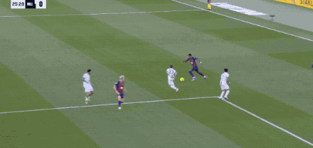 上半场结束,巴萨1-0暂时领先。下半场开始仅仅3分钟,亚马尔突入禁区,和对手有接触后倒地,裁判示意没有点球,比赛继续。