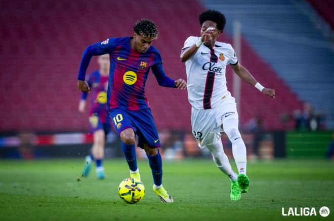 第25分钟,巴萨打出快速反击,莱万分球后全速向前,亚马尔的传球差一点就打穿马洛卡的防线,相当懊恼。