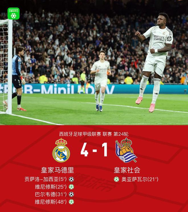 北京时间2月15日西班牙足球甲级联赛 联赛 第24轮,皇家马德里主场对阵皇家社会。上半场,阿诺德助攻,贡萨洛-加西亚破门。赫伊森送点,奥亚萨瓦尔主罚命中。维尼修斯造点并亲自罚入,卡雷拉斯助攻,巴尔韦德破门。下半场,维尼修斯再次造点并亲自罚入。全场比赛结束,皇马4-1击败皇家社会,取得西甲联赛8连胜,并且在先赛一场的情况下暂时超越巴萨排名西甲榜首。
