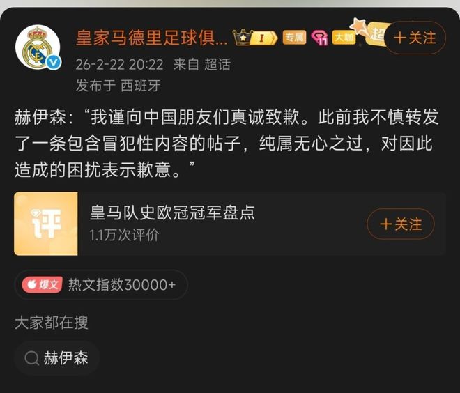 “道歉”仅仅表示赫伊森"不慎转发""无心之过",皇马官网、国际社媒账号及赫伊森个人账号没有同步内容。