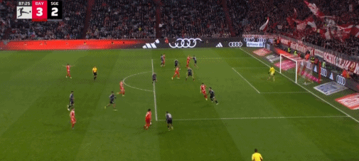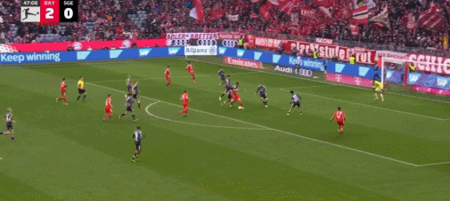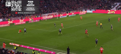 第86分钟,基米希传出刀山球,金玟哉将球踢到卡利穆恩多身上弹进球门,拜仁3-2