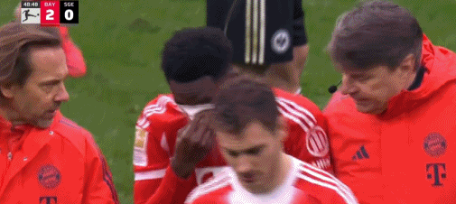 第23分钟,阿方索-戴维斯倒地后被踩到脚踝,随后有些痛苦