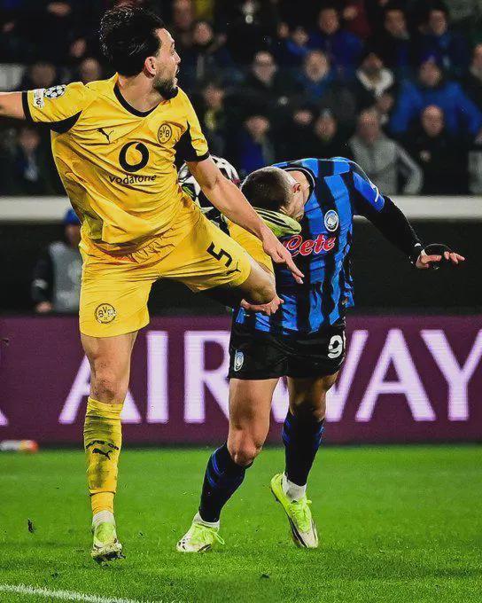 真正的戏剧性在补时阶段爆发。第94分钟,多特门将科贝尔后场玩火,传球被斯卡马卡断下,亚特兰大迅速发动传中,克尔斯托维奇在禁区内争顶时,本塞拜尼用一记“蝎子摆尾”解围,却不慎用鞋钉踢中了克尔斯托维奇的面部——鲜血瞬间从黑山前锋的额头涌出,他痛苦地倒在地上翻滚。