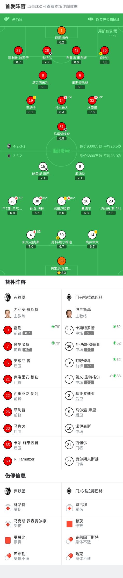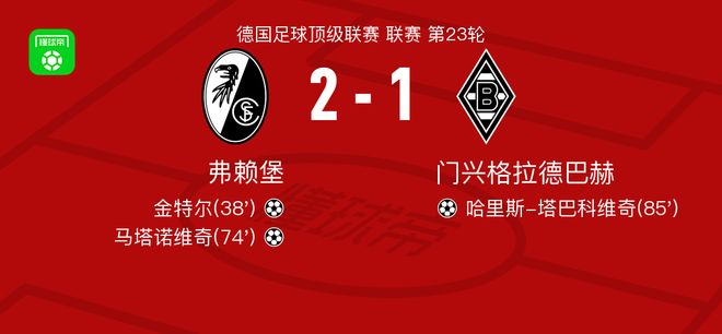 北京时间2月22日德国足球顶级联赛 联赛 第23轮,弗赖堡主场对阵门兴格拉德巴赫。弗赖堡金特尔破门,马塔诺维奇破门。门兴格拉德巴赫哈里斯-塔巴科维奇破门。最终比分弗赖堡 2-1 门兴格拉德巴赫。