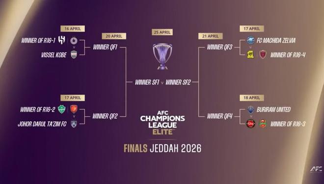 亚冠精英赛1/4决赛将在沙特举行,首场1/4决赛定于4月16日开打,第二、第三场将于4月17日进行,最后一场在4月18日。半决赛首场定于4月20日,第二场在4月21日。4月25日,亚冠精英赛决赛将在阿卜杜拉国王体育城体育场举行。