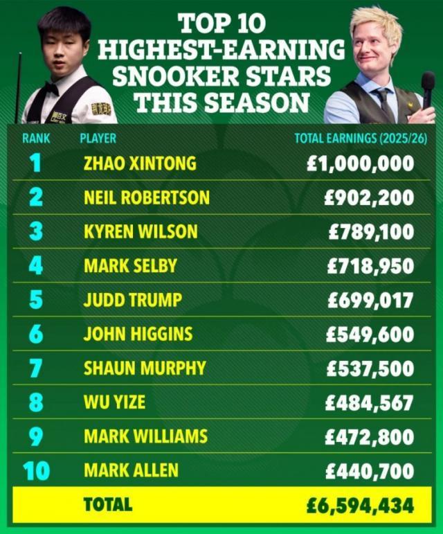 2025/26赛季斯诺克奖金收入排行榜:赵心童100万英镑位列第一